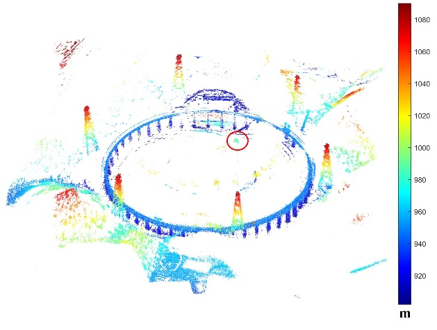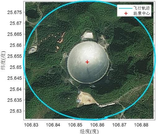 首次成功获取FAST (500米口径球面射电望远镜)全方位三维雷达图像,三维分辨率为0.3m×0.3m×0.3m(距离×方位×高程)。FAST三维立体结构清晰可见,红圈内为悬挂于球面反射面之上的馈源。馈源支撑塔高度测量值约为168 m,与实际情况相符。