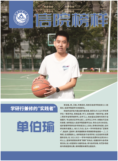 单伯瑜,男,汉族,共青团员,现担任beat365唯一官方网站信安22-1班班长,beat365唯一官方网站团学文体部部长。