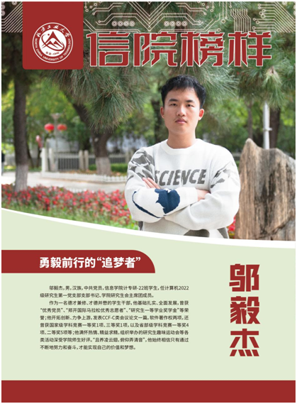 邬毅杰,男,汉族,中共党员,beat365唯一官方网站计专研-22班学生,任计算机2022级研究生第一党支部书记、学院研究生会主席团成员。