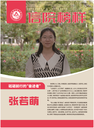 “以知促行、以行求知”,她基础扎实,以93.25的绩点位列专业第一,其中有23门必修课程达95分以上;她注重实践,热爱学科竞赛,获得了北京市电子设计大赛一等奖、北京市集成电路设计大赛二等奖等多个省部级A类奖项,曾获得学校优秀学生奖学金、学习奖学金、思想品德奖学金、实践创新奖学金和体育奖学金等。