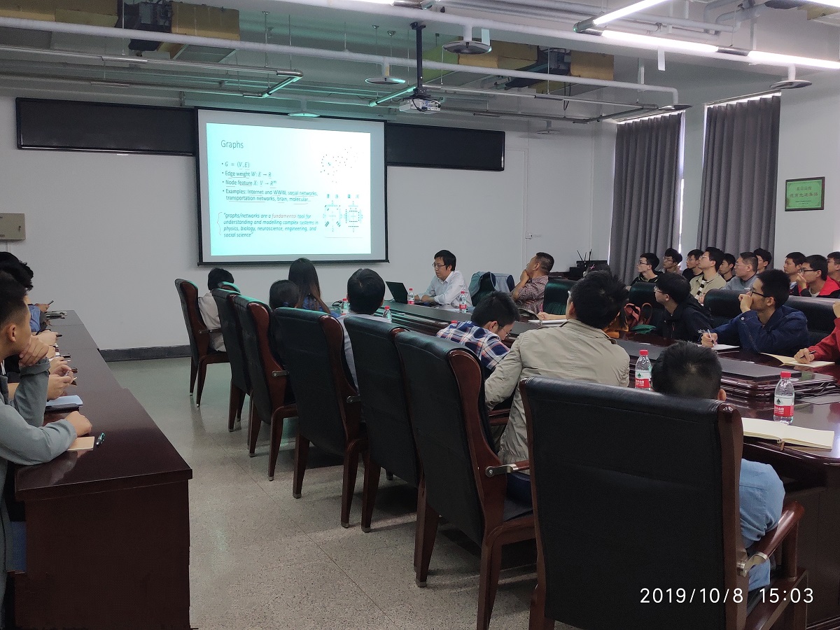 喻坚博士在报告中介绍了图嵌入的基本概念,详细讲解了基于嵌入的矩阵分解方法、基于嵌入的随机游走方法以及基于嵌入的深度神经网络方法等,并介绍了图嵌入技术在服务推荐中的应用,还介绍了喻坚博士最近发表在服务计算领域国际顶级学术会议ICSOC’19上的一个工作。最后,喻坚博士详细解答了师生们的提问。