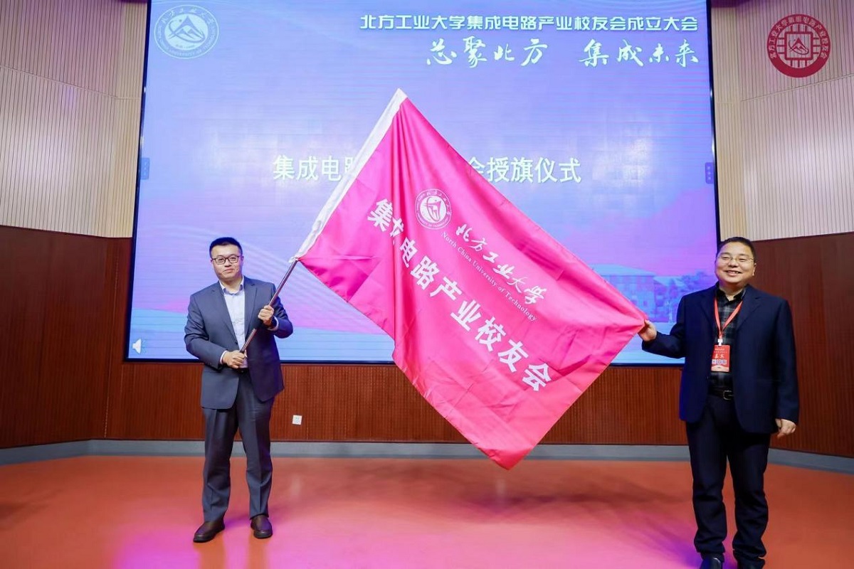 集成电路产业校友会经历了两年多的酝酿和筹备,在学校第77个校庆日举行成立大会。微电子专业08级校友温佳欣作为筹委会代表汇报了校友会的筹备过程。大会选举产生了集成电路产业校友会第一届理事会名单,其中袁立栋(03级微电子专业、国汽智控(北京)科技有限公司总经理)、周锡刚(05级电信专业、金蚂蚁集团董事长)、温佳欣(08级微电子专业、摩尔线程智能科技有限公司资深工程师)分别当选集成电路产业校友会第一届会长、常务副会长、秘书长。学院党委书记王伟宾为校友会授旗,并与闫江教授一同为当选的会长、常务副会长、秘书长颁发聘书。