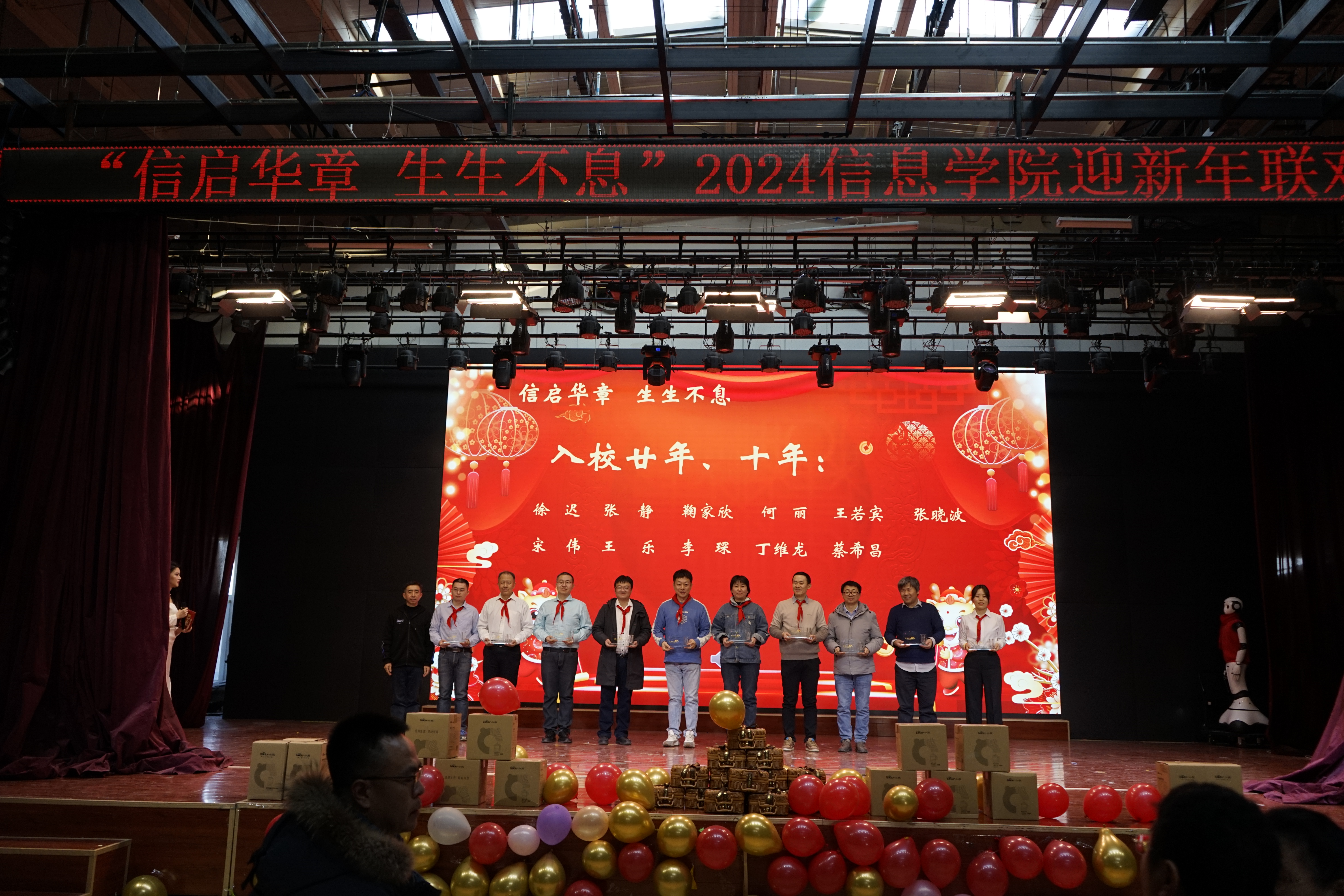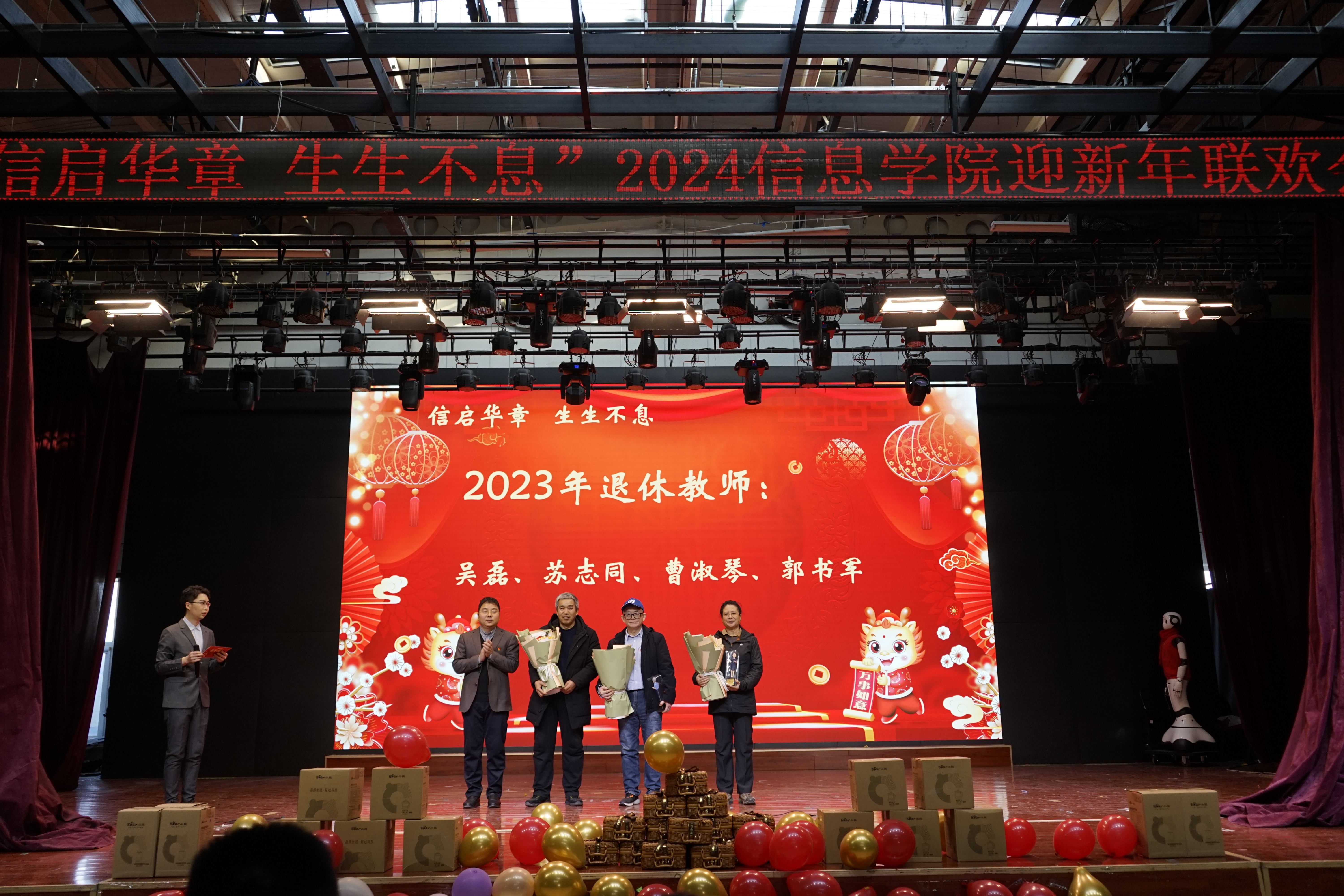 联欢会活动过程中,学院党委书记王伟宾代表学院发布学院院史,他深情回顾了40多年来学院相关专业、学科、人才培养等所取得的标志性成果,让老师们从院史中感受到荣誉感和归属感的同时,更多地汲取未来前进的智慧和力量。学院为2023年退休的老教师以及在校工作满整数年的老师颁发了纪念品。