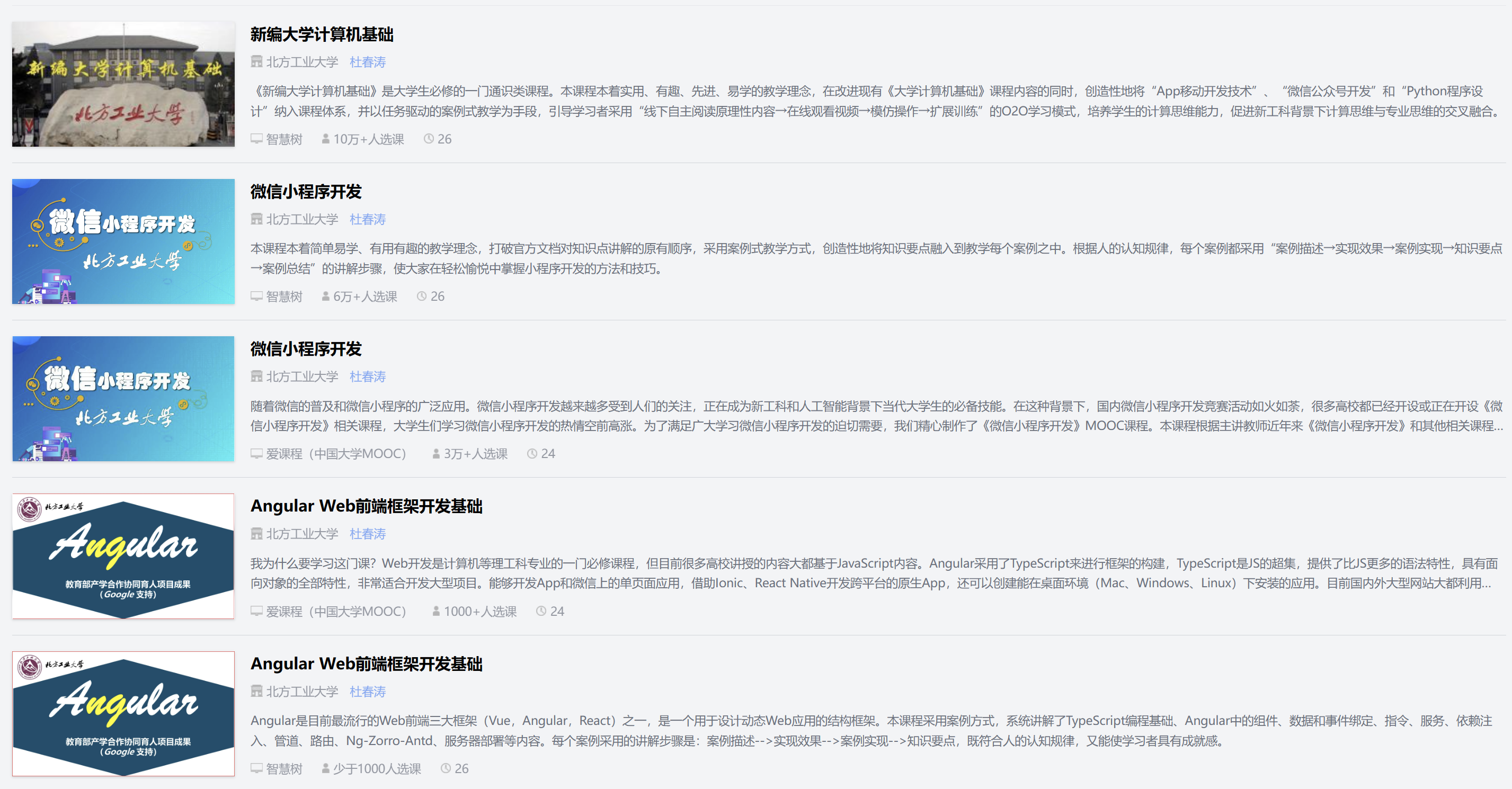 教育部副部长吴岩指出“坚持以学生为中心,以慕课为牵引,动员广大教师开展在线学习、翻转课堂、混合式教学等教学模式改革”,为推动信息技术与教育教学深度融合,杜春涛教授自2018年以来在教育部产学合作协同育人项目支持下,先后建设《新编大学计算机基础》(2018年)、《微信小程序开发》(2019年)、《Angular Web前端框架开发基础》(2021年)和《Dart语言》(2022年)等4门慕课,并以润物无声方式融入了大量思政元素以期实现育人的道术相济。其中3门上线国家高等教育智慧教育平台,累计选课人数超过30万。其中《新编大学计算机基础》获评中国高校计算机教育MOOC联盟2019年优秀课程目前选课人数超过18万,选课学校297所,累计互动154万多次。《微信小程序开发》选课人数超过10万,获评第二批国家一流线上课程。